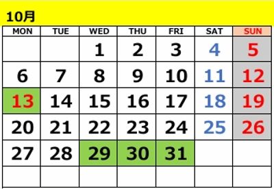 ★10/13(月)、10/29(水)、10/30(木)、10/31(金)、は振替日で通常レッスンはお休みとなります。